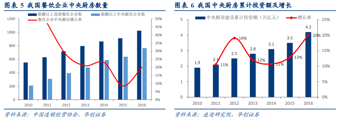 我国中央厨房市场规模。我国中央厨房目前尚处于成长期。2004 年国内首个以中央厨房经营模式为核心的餐饮企业——福记食品在港交所上市,经历多年发展直到 2011 年国务院中宣办提出“中央厨房”加工的概念,才逐渐从餐饮和食品行业分离出来单独作为一种新兴业态。