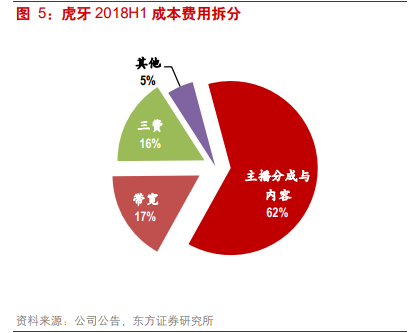 从成本端来看,主播分成与内容成本、带宽成本占据主导。虎牙 2018H1 主播分成与内容成本占总成本的 62%,该项成本主要受到分成比例的影响。各个平台分成比例(平台自留部分)略有不同,虎牙的平台分成比例约为 50%,斗鱼为 55%,而泛娱乐直播平台的分成比例则相对较高,映客、陌陌和 YY 分别达到 70%、60%和 55%。以虎牙为例,假设观众打赏 100 元,平台将获得 50 元,剩下 50 元公会和主播将自行协商分配,一般主播能拿到 50 元中的 70%到 90%,即 35-45 元。此外,虎牙带宽费用占据总成本的 17%,这是由游戏直播的高 MAU 的观看特性所决定,受益于带宽平均价格的下降及云技术等技术进步,带宽成本占比正在不断下降。