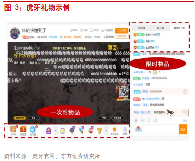 从收入端来看,直播业务收入(即打赏等)为平台主要收入来源。以虎牙为例,2018Q2 直播业务占据了总收入的 96%,直播业务主要包括用户在平台上打赏或消费的物品。用户在消费前,必须先以现金等方式充值换取虚拟币,用来购买一次性物品或者限时物品:一次性物品指的是直接送给主播的礼物,价格从 0.1 元到 5,000 元不等;而限时物品类似于 QQ 会员,购买之后用户可拥有部分特权,如彩色弹幕、专属礼物等。限时物品共分为六个等级,价格从 50 元到 15,000 不等,并且每月需要续费维持特权,不同价格的物品满足各个层次付费用户的消费需求。