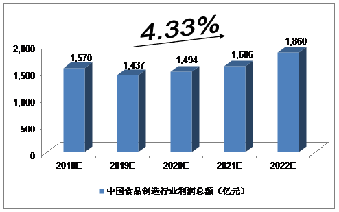 我们预计,2018年我国食品制造行业利润总额将达到1,570亿元,未来五年(2018-2022)年均复合增长率约为4.33%,2022年将达到1,860亿元。