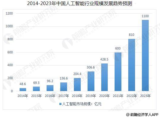据前瞻产业研究院发布的《人工智能行业市场前瞻与投资战略规划分析报告》数据显示,2015年中国人工智能市场规模69亿元,同比增长40%, 2016年达到96亿元,此后在技术和应用的驱动下,继续快速发展,同比增速超过40%,到2023年市场规模达到1100亿元,并带动相关产业规模增长超过1000亿元。