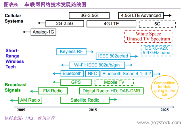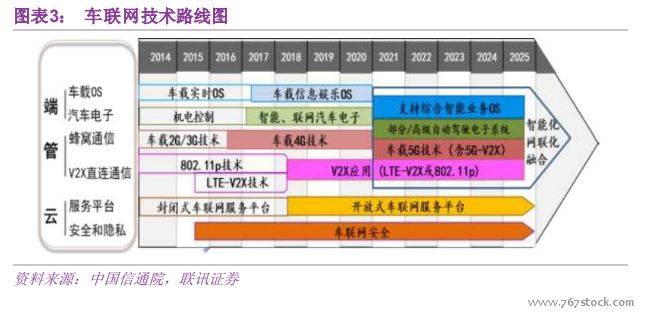 C-V2X:3GPP 主导。C-V2X(Cellular Based V2X)是基于移动蜂窝网的车联网通信技术。以 LTE 蜂窝网络作为基础的 C-V2X 称为 LTE-V2X,未来基于 5G New Radio(新空口)蜂窝网络的C-V2X 称为 5G-V2X。2015 年 2 月和 6 月,3GPP 的 SA1 和 RAN1 工作组分别设立了专题“LTE 对 V2X 服务支持的研究”和“基于 LTE 网络技术的 V2X 可行性服务研究”,标志着 LTE V2X 技术标准化研究的正式启动。2017 年 3 月,3GPP 完成 Release14LTE-V2X 核心标准制定,其中包括应用层、网络层、接入层所有的标准体系都已经完备,预计 2019 年前后冻结。