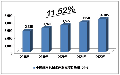 我们预计,2018年我国新增机械式停车库项目数量2835个,未来五年(2018-2022)年均复合增长率约为11.52%,2022年将达到4385个。