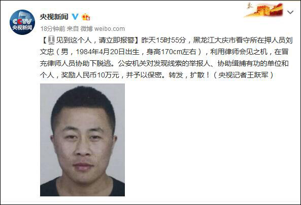 @央视新闻10月19日消息,昨天15时55分,黑龙江大庆市看守所在押人员刘文忠(男,1984年4月20日出生,身高170cm左右),利用律师会见之机,在冒充律师人员协助下脱逃。公安机关对发现线索的举报人、协助缉捕有功的单位和个人,奖励人民币10万元,并予以保密。转发,扩散!
