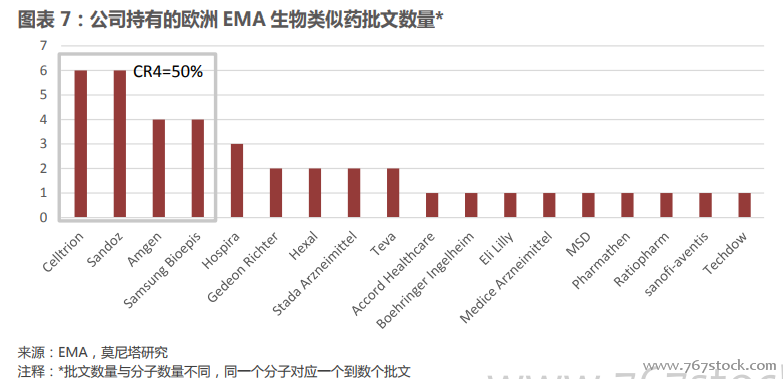 生物类似药批文数量集中于少数几家公司。欧洲EMA批准的一共40个生物类似药批文归属于18家公司,其中拥有批文最多的前四家公司覆盖了20个批文,占比50%,批文集中度较高。虽然在这18家公司中不乏Sandoz、Teva这样的传统仿制药企业,但是在领先公司中,Celltrion、Samsung Bioepis这样成立时间不久,专门进行生物类似物研发的公司的表现格外抢眼。