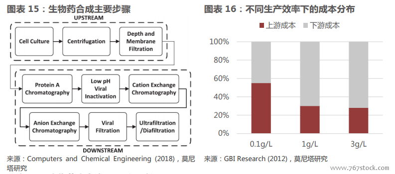 生物类似药结构复杂仿制困难。仿制药品的技术关键可以简单划分为两个方面,一个是有效成分(Active PharmaceuticalIngredient, API)的仿制,另一个是制剂工艺的仿制。对于化学仿制药来说,有效成分通常是通过化学合成的小分子,结构明确,仿制较为容易,仿制难点通常出现在制剂工艺上。尤其对于口服化学仿制药,制剂工艺直接会影响药品的在人体内的溶解、吸收、代谢,进而影响药品的治疗效果。而生物类似药由注射给药,一般情况下不存在由制剂工艺引发的溶解、吸收问题,而有效成分的仿制通常是技术难点。生物类似药的有效成分一般是生物合成的大分子蛋白质,分子结构复杂,生产流程长,因此实现有效成分的相似性是较为困难的。