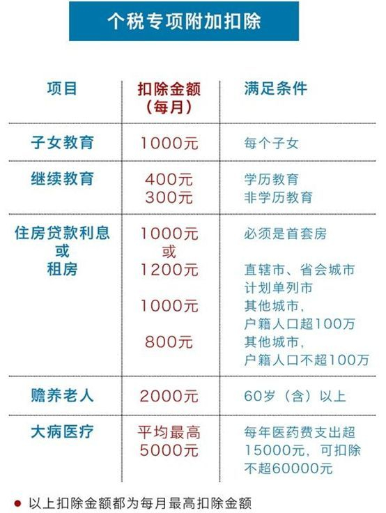 此次公布的暂行办法征求意见稿明确,增加子女教育、继续教育、大病医疗、住房贷款利息、住房租金、赡养老人支出等6项专项附加扣除。