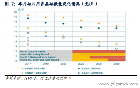 光伏级多晶硅需求持续增长,全球供需相对偏紧。我们根据国际光伏技术路线图(ITRPV)中对单片硅片耗硅量变化的预计,结合对未来光伏转换效率的预计,得出了多晶硅需求量与光伏装机量之间的换算关系。根据 BNEF 预计,2018-2020 年,一般情形下全球光伏装机为 103、131 和 156GW,乐观情形下为 113、147 和 175GW。我们根据以上数据对未来全球光伏级多晶硅需求量进行简单测算。