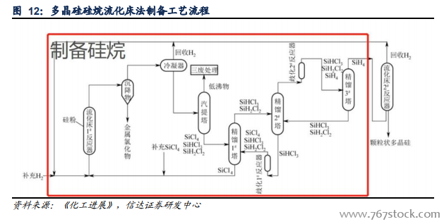 改良西门子法仍将是多晶硅生产主流工艺。1955 年,德国西门子公司成功开发出三氯硅烷在氢气氛围下,在炙热的硅芯/硅棒表面上沉积硅的工艺技术,并于 1957 年开始工业化生产,即“西门子法”多晶硅生产工艺。但西门子法多晶硅转化率低,四氯化硅等副产品污染严重,因而增加了尾气回收和四氯化硅氢化工艺的改良西门子法得以提出。