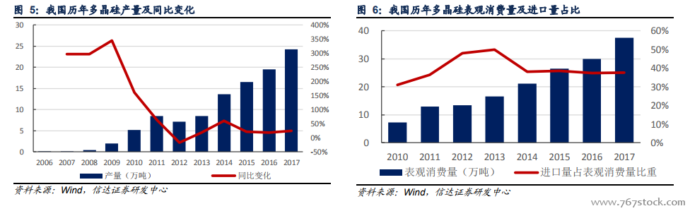 全球多晶硅供应集中度较高,国内产能投放加速。据我们统计,截至 2017 年底,全球多晶硅生产企业中,产能达到万吨级以上的不足 20 家企业,其中瓦克、江苏中能和 OCI分别拥有 8.0、7.4 和 6.58 万吨,位于行业前三位,行业前 10 企业合计拥有产能 38.48 万吨,市场集中度较高。至 2017 年底,我国在产多晶硅企业有 22 家,同比增加 5 家,有效产能共计 27.6 万吨/年,同比增长 6.6 万吨/年。