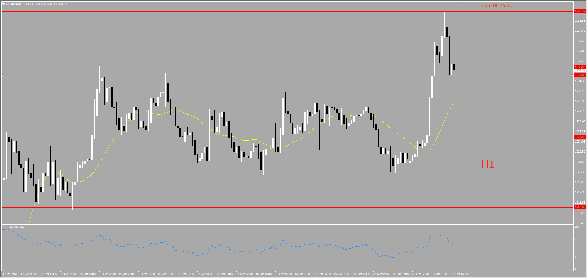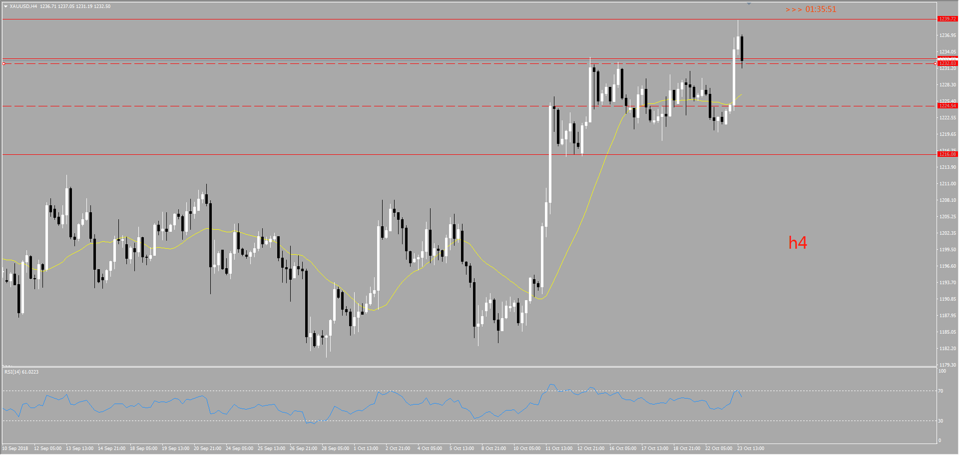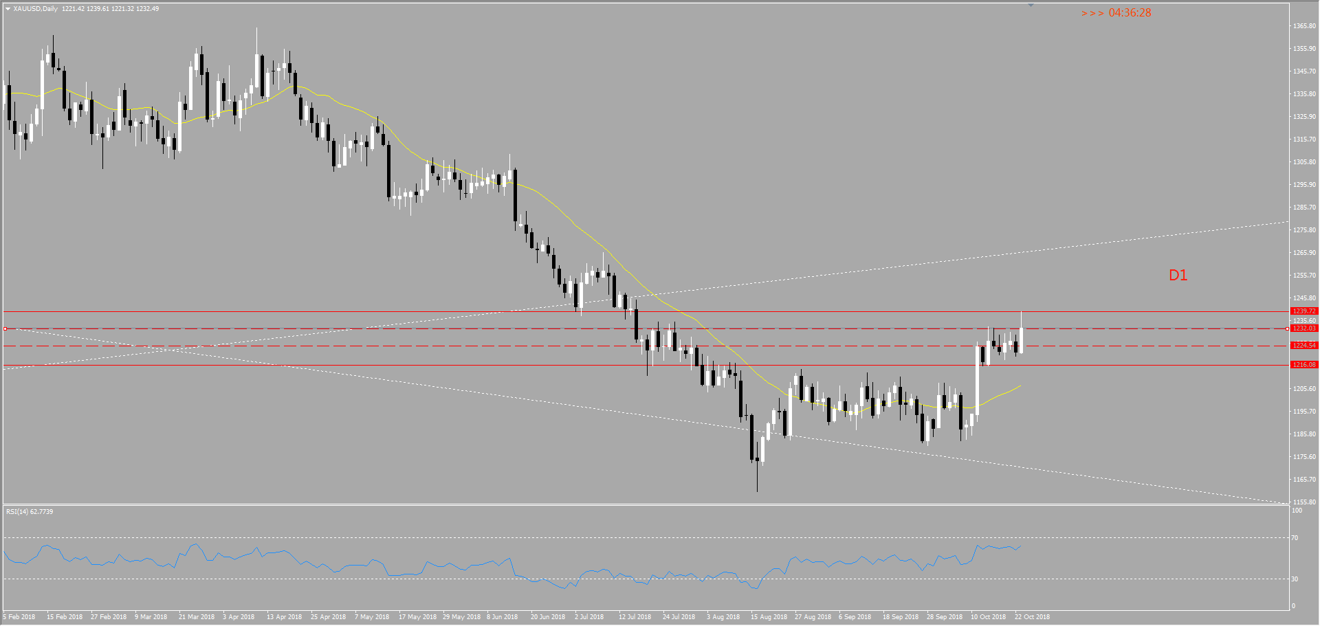 天图上看此时此刻位于调整→上冲→调整→上冲阶段中,下方支撑为也就是前期调整趋势中的高点1231.8附近,上方阻力位于1240附近。但是日线上看今天已经上触到这个位置,但是市场好像还不能接受这个价位很快又向下回落在高位盘整上方支撑位得到支撑。从趋势分析角度来看价格任然处于多头趋势当中,但是要继续维持向上攻势必须要回落进行调整积累能量。从RSI 指标也可以看出目前向上动能不足,可能很快就会进行回落调整。我们关注的重点在于价格回落的幅度,第一支撑位1231.8附近,第二支撑位1221.8附近,第三支撑位1216附近。操作我们依然以看多思路操作。向下回调到支撑位时根据价格形态进场并设好止损进场多单。如果回调幅度很小没有达到关键支撑位直接向上,此时我们也不要着急进场,等待价格突破1240关键阻力位后,在此回调进场多单即可。向上看150点左右遇见一个阻力。