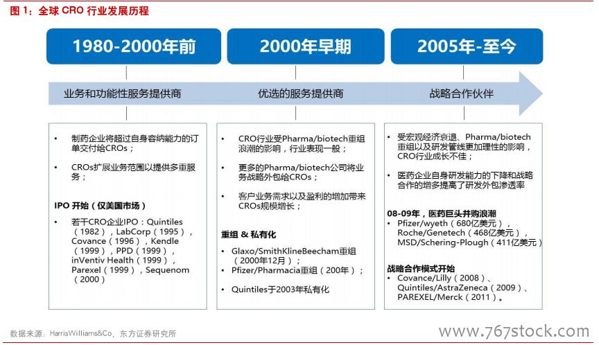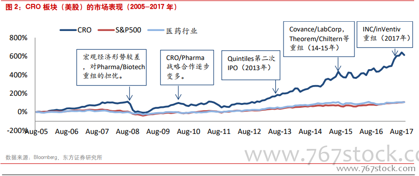 行业集中度大幅提升,龙头地位趋于稳固。我们发现,近年来全球 CRO 企业集中度大幅提升,规模层次明显。由于 2011-2012 年专利悬崖达到顶峰、药企研发投入减少,在资本驱动下 CRO 行业逐步进入到并购整合浪潮当中:以 Kendle/INCResearch,Convance/LabCorp,Theorem/Chiltern,WIL Research/CharlesRiver 等并购为标志性事件。