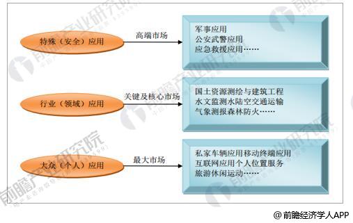 根据卫星导航与位置服务市场中消费用户的分布情况,主要分为特殊(安全)应用市场、行业(领域)应用市场和大众(个人)应用市场三大类。