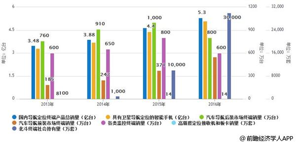 据前瞻产业研究院统计,2016年国内导航定位终端产品总销量突破5.3亿台,其中具有卫星导航定位功能的智能手机销售量达到5.1亿台,其中带北斗功能的数量超过30%。汽车导航后装市场终端销量达到800万台,汽车导航前装市场终端销量突破550万台,各类监控终端销量在600万台左右,高精度定位接收机14万台/套。