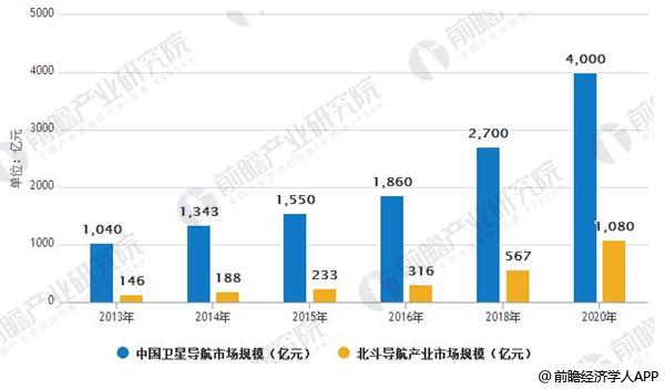 2013-2020年中国卫星导航与北斗导航产业市场规模及预测