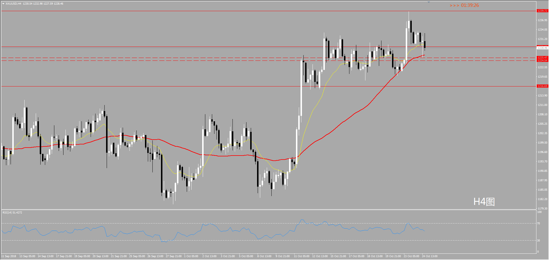 四小时上观察价格走势,经过昨天的下跌,价格在关键阻力位出向上反弹到上一波行情的0.382位置。但是随即又转头向下,向下的过程中我们重点关注两个支撑位,一个是前期盘整所形成的旗形形态所构成的上趋势线支撑位,另外一个是1225.5附近的支撑带。目前的价格来说我们还是要耐心等待,接下来的一天我们主要关注H1图在价格运动期间是否形成了关键的蜡烛图形态,如果在支撑位附近形成了可靠地蜡烛形态可以大胆进出场多单。但是需要强调的是这是一个概率性游戏,在进场任何单子我给出的建议就是一定要设置止损。