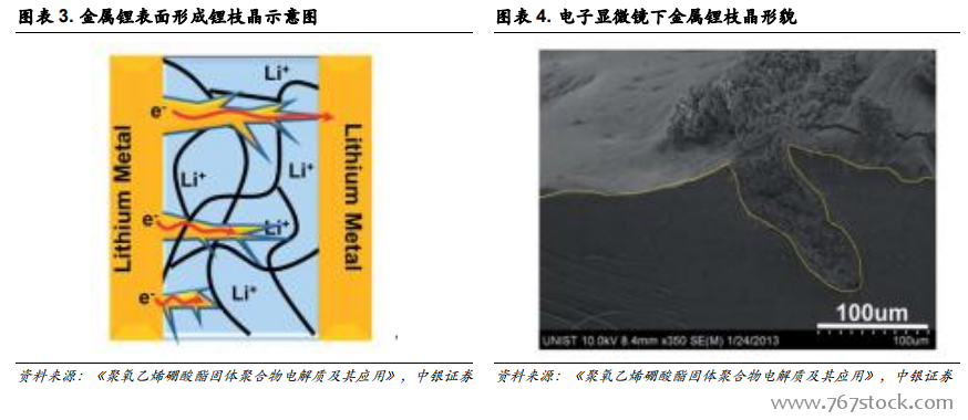 负极表面容易形成枝晶,刺穿隔膜,造成正负极短路,导致电池起火。液态锂离子电池普遍采用石墨作为负极,当负极表面不均匀时,在多次充放电循环过程中容易导致多余的锂在负极表面富集堆积,形成树枝状的锂枝晶。锂枝晶生长到一定的程度,可能刺穿具有微孔结构的隔膜,连接到正极极片,造成正负极短路。另一方面,新暴露在电解液中的锂枝晶会不断被电解液腐蚀,消耗电解液,降低电池循环寿命和容量。