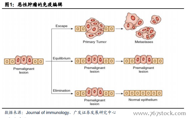 恶性肿瘤的免疫编辑。20世纪初期,Paul Ehrlich首次提出荷瘤体的免疫系统可识别并杀伤肿瘤。1959年,小鼠肉瘤排斥试验证实了肿瘤抗原的存在,并认为其可诱导荷瘤机体产生特异性免疫应答。70年代,Burent正式提出机体的免疫系统能够识别并杀伤癌细胞的免疫监视理论。随后发现,免疫系统发挥免疫功能的同时,肿瘤细胞会改变表面抗原并调整肿瘤微环境来逃逸免疫系统的识别,从而逃避机体免疫监视,这个过程称之为恶性肿瘤的免疫编辑(Cancer immunoediting),也是癌症发生的免疫学过程,免疫编辑由三个过程构成,即免疫清除(Elimination)、免疫平衡(Equilibrium)和免疫逃避(Escape)。