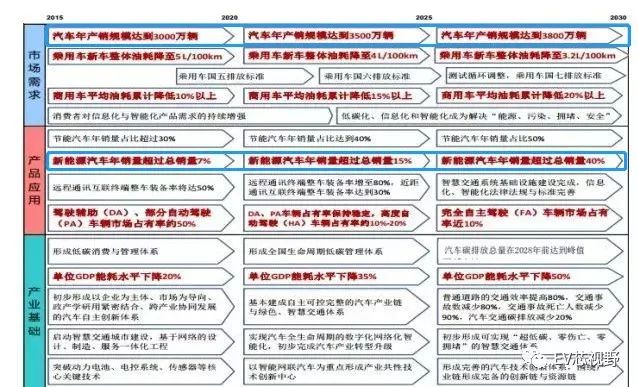 《节能与新能源汽车技术路线图》规划描绘了我国汽车产业技术未来15年发展蓝图,路线图表明: