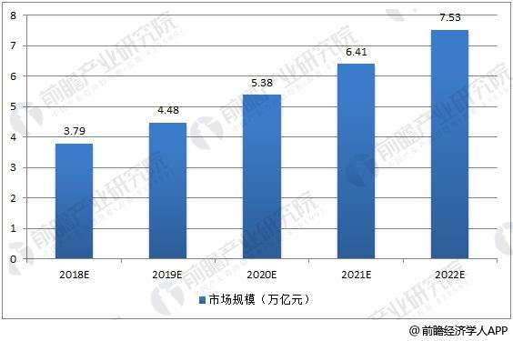 据前瞻产业研究院发布的《新材料行业市场前瞻与投资战略规划分析报告》数据显示,中国新材料产业总产值由2012年的1万亿元增加到2016年的2.65万亿元,年均增速27.6%。预计,2018年中国新材料产业市场规模将达到3.79万亿元,未来五年(2018-2022)年均复合增长率约为18.72%,2022年中国新材料产业市场规模将达到7.53万亿元。