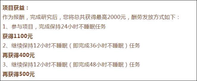 近日,一则招募公告突然刷屏,这则招募公告里写着:只要完成保持24小时不睡眠任务即可获得1100元,完成36小时不睡眠任务获得1500元,完成48小时不睡眠任务获得2000元。