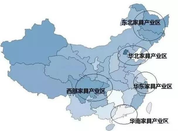 如上图所示,中国家具业经过几十年的发展,产能逐渐集中,产生了五大家具产业集群,分别是华南家具产业区、华东家具产业区、华北家具产业区、东北家具产业区、西部家具产业区,这些地方集中了中国90%的家具产能。