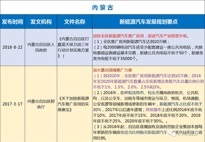 (5)内蒙古:计划全区推广应用新能源汽车10万辆。(有态度就是好的,毕竟内蒙古2018年1月的新能源汽车保有量约7300辆,充电站39家,充电桩508个)