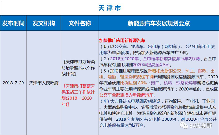 (2)天津市:每年新增2万辆,2020年占比达4.5%;2020年底前公交车全部更换为新能源车辆。