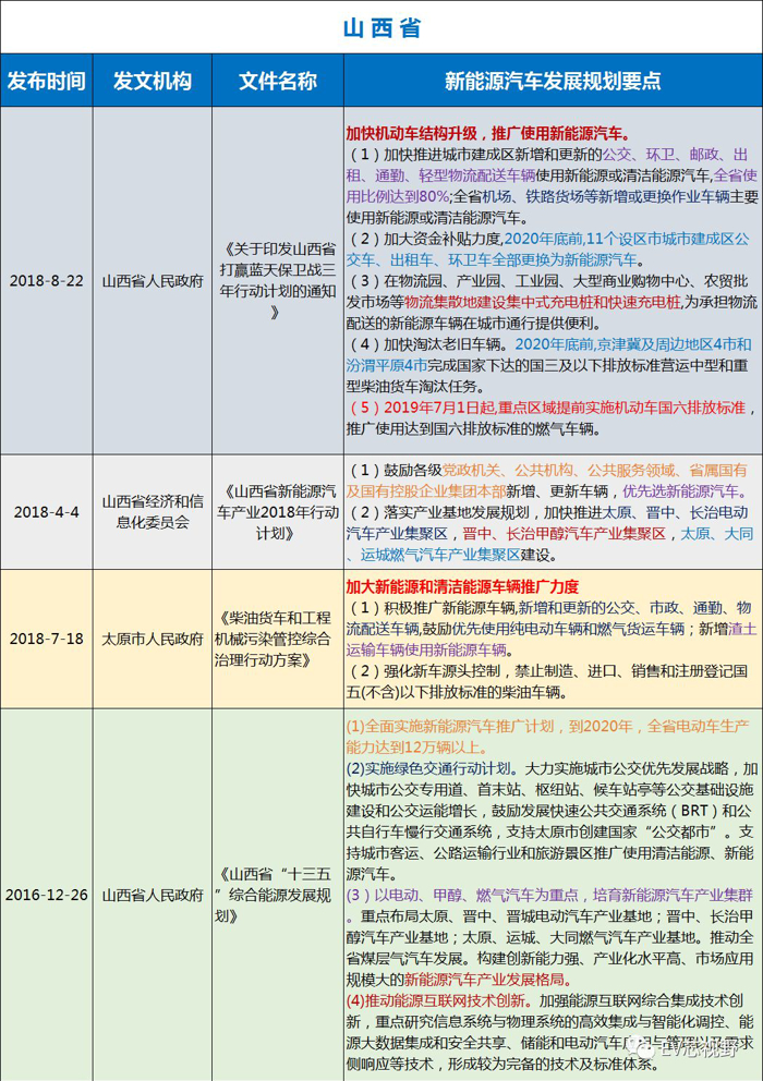 (3)山西省:2020年底前,11个设区市城市建成区公交车、出租车、环卫车全部更换为新能源汽车;全面实施新能源汽车推广计划,到2020年,全省电动车生产能力达到12万辆以上。