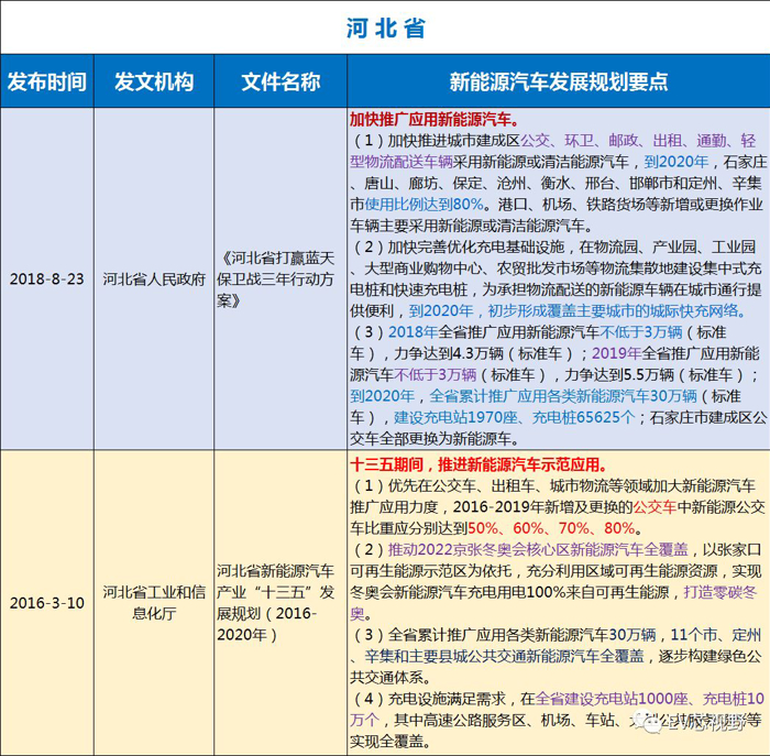 (4)河北省:2018年不低于3万辆,力争4.3万辆;2019年不低于3万辆,力争5.5万辆;到2020年,全省累计推广应用各类新能源汽车30万辆,建设充电站1970座、充电桩65625个;石家庄市建成区公交车全部更换为新能源车。