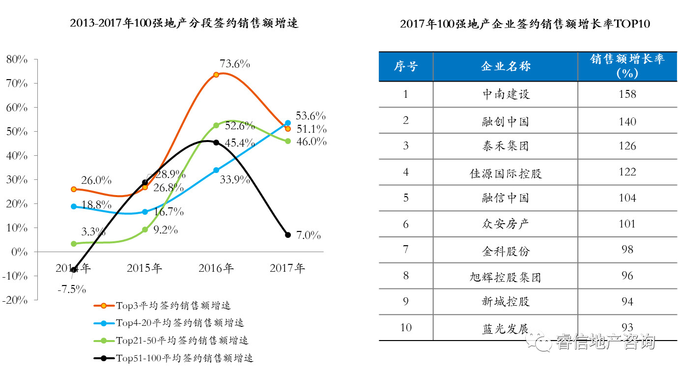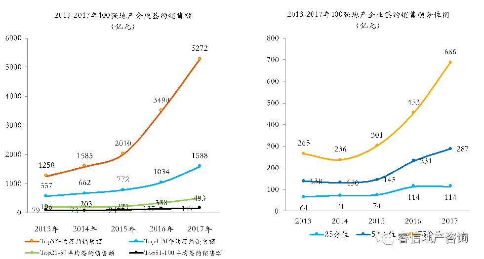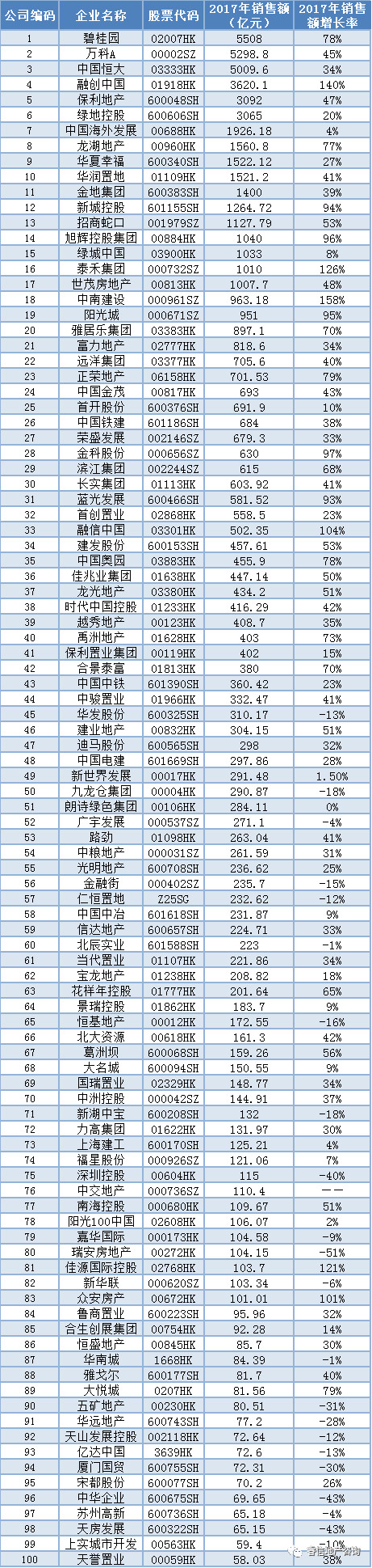 睿信地产研究院根据2017年上市地产企业披露数据,对已披露销售额数据的前100名企业进行了统计分析,具体情况如下: