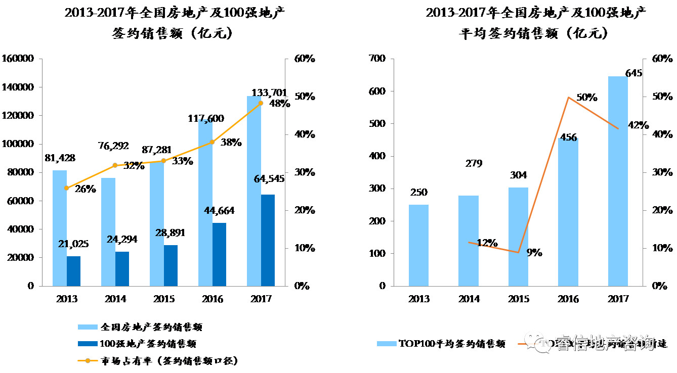 2017年,全国商品房销量再创新高,但增幅趋于平缓。100强企业的市场占有率持续高走,千亿俱乐部再添6位新成员。50强企业以50%幅度高速增长,中小企业增速大幅下滑,TOP51-100签约销售额平均增速仅为7%。