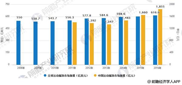 近年来运动服饰市场增速高于服装整体,据前瞻产业研究院发布的《运动服行业市场前瞻与投资战略规划分析报告》数据显示,2008-2016年全球运动服饰市场规模从550亿增长至616.6亿美元,CAGR 为1.4%。2016年全球运动服饰延续复苏态势,同比增长2%。国内运动服饰复苏明显,2012-2013 年因结构性调整,运动鞋服市场规模同比下滑1.83%、3.23%,此后进入双位数高速增长阶段。2020 年中国体育运动用品消费总规模将达到1.5 万亿元人民币,未来提升空间较大。