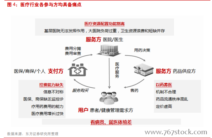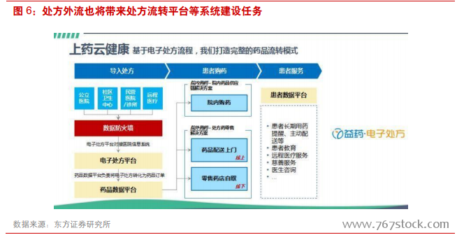 处方外流将带来处方流转平台等系统建设任务。在药品流通方面,随着医药分离政策的推进,过去由医院药房占据处方药销售主导的格局正在被打破,医疗机构处方信息、医保结算信息与药品零售消费信息的互联互通、实时共享已成为趋势,这必然带来处方流转平台等系统的建设需求。