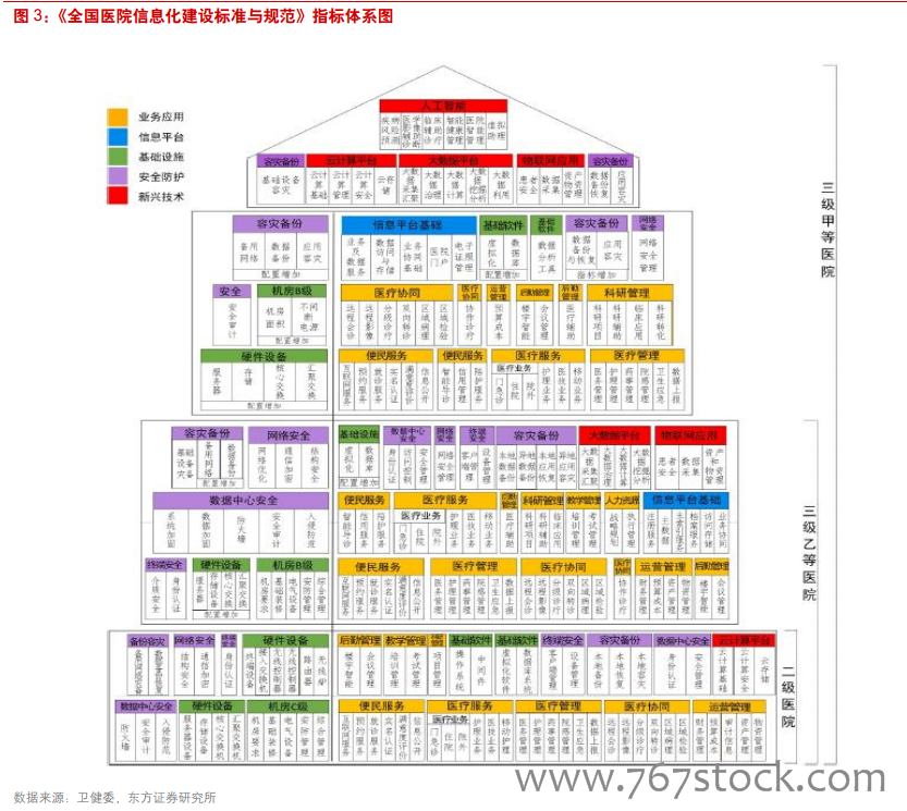 政策推动医疗信息化建设提速。自 2009 年新一轮医改将信息化建设作为支撑医改的四梁八柱以来,国务院、卫计委(卫健委)持续出台各项政策,明确医疗信息化建设的目标与任务,包括要求医院以电子病历为核心建设医院信息系统、2020 年实现人口信息、电子健康档案和电子病历三大数据基本覆盖全国人口、促进“互联网+医疗健康”发展等一系列,此外,还组织开展电子病历应用水平分级评价、医院互联互通标准化成熟度测评,对医疗信息化的普及与深入应用起到积极的推动作用。