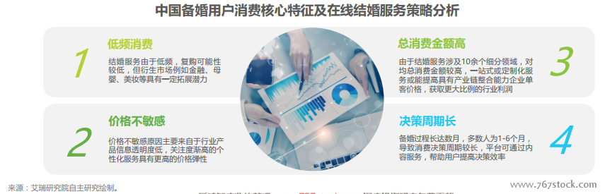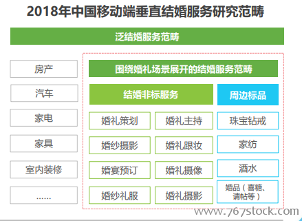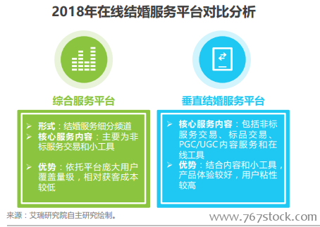 向B端收费,营销费、佣金和展位费是主要营收方式。在线结婚服务平台盈利模式主要包括线上盈利模式和线下盈利模式(线下用户来自于线上转化,促进转化的主要方式是电销),其中线上盈利模式主要为佣金和营销费(广告费和技术服务费),线下盈利模式主要为展位费、冠名费和广告费。而根据在线结婚服务平台类型不同,现阶段综合性服务平台线上核心营收主要来自广告费,而垂直服务平台线上核心营收主要为广告费、技术服务费和佣金。艾瑞分析认为:目前移动端垂直结婚服务平台处于初期成长阶段,未来随着核心企业借助自身技术优势,通过提供云服务等方式帮助平台入驻商家提高企业运营效率,移动端垂直结婚服务平台的商业化探索将存在更多可能性。