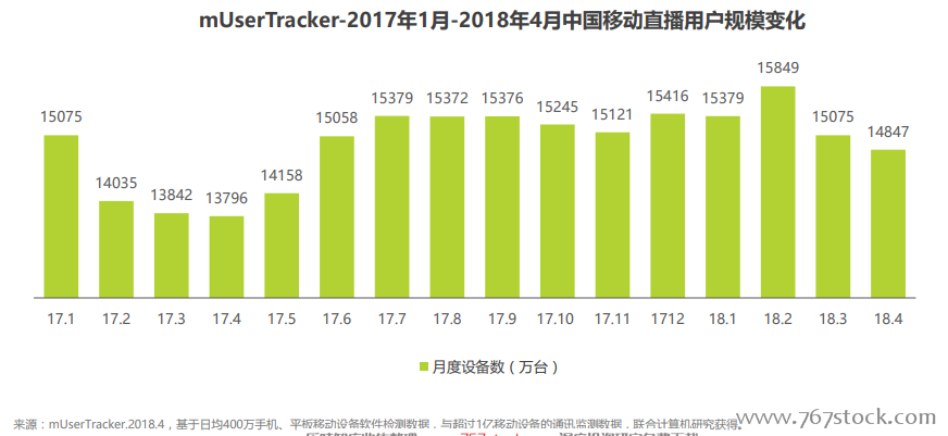 直播行业月度设备数量有所增长,总体趋于稳定。根据艾瑞mUserTracker数据显示,经过2017年上半年直播行业快速发展之后,2017年下半年和2018年直播行业用户规模趋于稳定。其中,2018年2月设备数达到顶点,同比2017年2月增加12.9%。