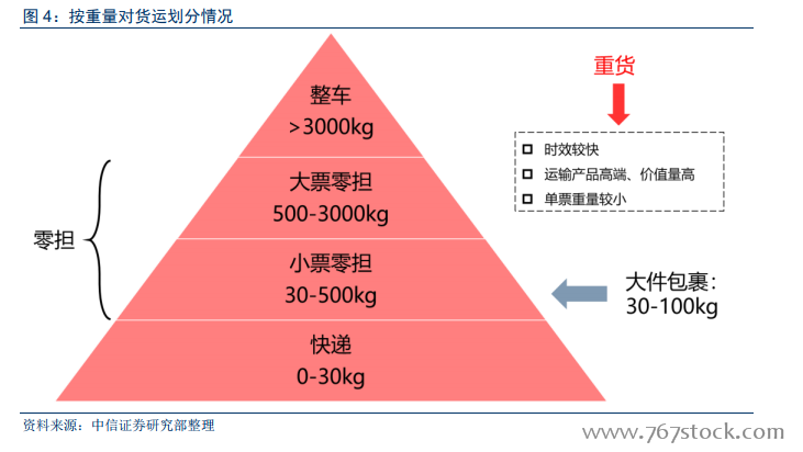 公路货运按照单票运输重量划分为快递、零担和整车三个市场。公路货运可以按照单票重量小于 30KG、30KG-3T、大于 3T 三个区间段可以划分成快递、零担和整车三种货运类型。其中零担市场又可以按照 30-500KG、>500KG 划分成小票零担和大票零担,而小票零担还可以进一步划分成大件包裹(30-100KG)和其他小票零担(100-500KG)。而我们经常所说的、以及下文要重点讨论的重货,其货运重量一般偏低,而且运输的一般是产品附加价值较高的高端货物。