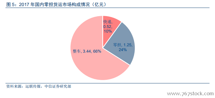 零担市场规模 2.5 倍于快递市场,散乱小是行业特点。据运联传媒测算,2017 年我国公路货运市场规模在 5 万亿元左右,其中零担市场规模高达 1.25 万亿元,占比 24%,是快递行业的 2.5 倍(快递行业规模近 5000 亿元)。与行业龙头涌现、竞争格局垄断、服务高标准化的快递行业相比,零担行业呈现小散乱:企业数量众多且规模较小、市场竞争混乱且主打价格战、企业主要以粗放式管理发展、行业规范化和标准化程度低。