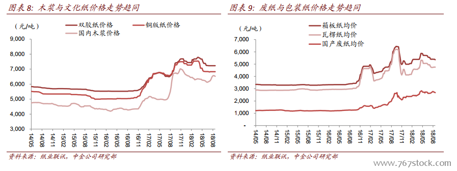 国内纸浆定价跟随国际供需,国产废纸定价侧重国内供需:我国造纸行业原料供应难以自足,需要依赖进口,2017 年纸浆自给率 43.9%(其中木浆自给率 33.3%,非木浆自给率100%),废纸自给率 63.8%。低自给率背后原因在于我国森林保有量有限且废纸回收率较低。向前看,我国纸浆自给率难以提高,国内纸浆价格遵循国际定价,价格变动以国际供需变动为指引;而因我国废纸进口政策收紧及废纸回收率提高,国产废纸价格将更多考虑本国供需而非全球供需。