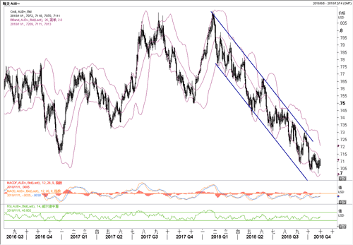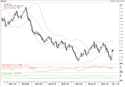 近期有关英国脱欧谈判协议方面不断流出利好消息,英国两位官员表示,英国和欧盟在英退后给予伦敦主要金融中心的欧盟市场基本准入方面取得进展,但尚未敲定协议。英国脱欧大臣拉布表示,预计将在11月21日之前与欧盟敲定协议。只要英国最终能达成协议脱欧,则英央行的货币政策将会为进一步的加息打开绿灯。市场预期2019年将升息两次,不过,货币市场并未完全反映明年加息25个基点,凸显出投资者担心无序退欧是否能够避免。技术上,汇价反弹停滞于近期跌势1.3237-1.2694的61.8%回档位,随机指标显示短期指标超买,阻力位于4小时图200小时均线1.3045-50,然后为1.3100。支持位于1.2960-50,如破将指向1.2900附近,进一步的支撑在1.2845。本周将迎来美联储的议息会议,倾向在英镑的操作上设单1.31附近空英镑或者跌穿1.2970跟空英镑。