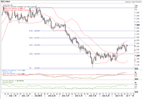 周初美股回升带动了风险情绪且美元在数据刺激下一举上破了97一线,黄金受压回踩前期横盘的顶1215美元一线附近,但随后中美领导人一通电话又为贸易摩擦带来了曙光,前期由于贸易担忧而大涨的美元遭到抛售,且英国方面传出了脱欧谈判方面的好消息也助推了美元的跌势,周四美元大跌使美元上破97成为了假突破。周初美元的动荡使周五好于预期的非农数据也没能引起多大波澜,因为市场的关注点聚焦于明天的美国中期选举,而上周黄金就是完全的对照着美元来反向走,所幸黄金只是回踩了一下之前横盘区间的顶部而没有有效跌破,1160美元起始的涨势还没有被破坏。