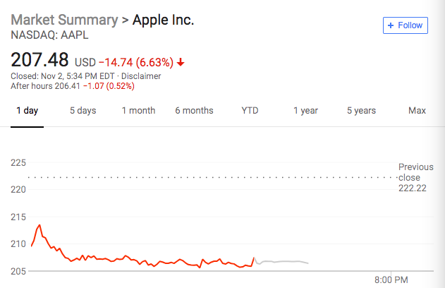 11月2日(美国时间),对于风光无限的苹果而言是个悲催的日子:股价大跌6.6%,创下四年以来最大跌幅,市值蒸发超700亿美元,按现在的汇率估算差不多有4900亿元人民币。