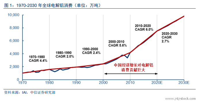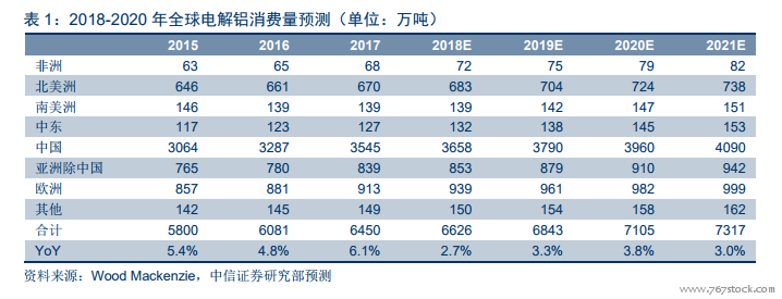 电解铝消费高速增长阶段已过,长期看增速趋缓。国际铝业协会(IAI)数据显示,全球电解铝消费从 2000 年开始进入高速增长阶段,其中中国电解铝消费量从 2001 年 364 万吨增长到 2017 年 3426 万吨,CAGR 为 14.1%,占全球铝消费总量比例从 15%增长至 54%,是过去二十年全球电解铝消费的主要增长动力。随着中国经济增速放缓,对铝消费需求拉动力减弱,全球铝消费增速也将逐渐下滑。