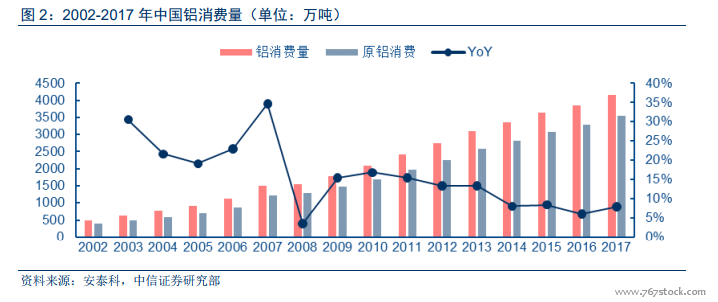 2017 年国内电解铝消费 3545 万吨,同比增长 7.8%。根据安泰科数据,2017 年国内铝消费总计约 4160 万吨,其中原铝 3545 万吨,同比增长 7.8%,随着国内经济增速放缓和结构调整,电解铝消费增速逐渐下滑趋稳。