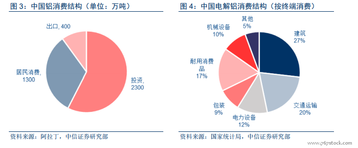 预计 2018 年国内电解铝消费增长 3.2%至 3658 万吨。根据安泰科数据,截止 2018 年8 月,国内电解铝消费量约 2758.5 万吨,同比增长 2.5%。受建筑、交通、电力等消费领域增速回落影响,2018 年国内电解铝消费增速预计将显著放缓,预计全年消费量为 3658 万吨,同比增速下滑至 3.2%。其中消费增量主要来自包装和耐用消费品领域稳定增长以及出口量大幅提升。2019 年随着国内地产、基建等领域消费回暖,电解铝消费增速有望恢复,预计2019/2020 年国内电解铝消费量分别为 3790/3960 万吨,同比分别增长 3.6%和 4.5%。