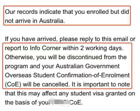 那天收到一封邮件,内容大致是:校方记录显示,虽然已经报名了,人却未抵达澳大利亚。提示如果已经抵达了,需要在2个工作日回复或和Info Corner联系,否则COE将会被取消,且影响到学生签证。