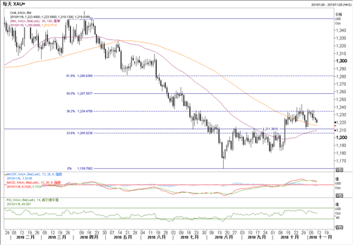 美元短期跌势收复了,但中期选举后分裂的美国国会对美国、美元的影响是长期的,不确定性也将增大。例如美国司法部长塞申斯在中期选举后马上被迫辞职,特朗普和塞申斯的分歧来自"通俄门"调查。黄金技术图上,短期空头占优,可能会继续回踩前期横盘的顶部,同时也是50日均线的1210美元,观察1210-1215美元的支撑力度,美元只要上破不了前高97一线,黄金可在支撑上方逢低做多,跌破1210美元止损,上方目标依然是强压力位1235美元。如果跌破1210美元,黄金这轮反弹宣告结束,又将陷入漫长的磨底行情当中。