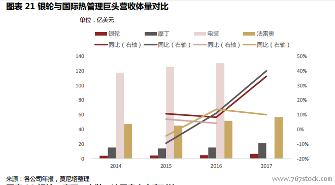 我们从业务体量发展(市占率发展)、费率与支出、利润率三方面对比银轮与摩丁、电装、法雷奥,同时分析银轮的潜在成长空间。从业务体量看,我们测算电装、法雷奥、摩丁、银轮目前在全球热管理行业的市占率分别约为28%、11.8%、4.4.%、1.3%。而根据我们之前的判断,未来三年预计全球热管理市场空间分别为 512 亿、537 亿、568 亿美元,对银轮而言,市场成长空间巨大。