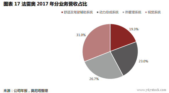 法雷奥。法雷奥 1923 年成立于法国,目前专注于汽车电子、自动驾驶、车联网等核心技术与产品的开发,主营业务范围包括辅助驾驶系统、动力总成系统、热管理系统、视觉系统四部分呢。2017年在 automotive news 的全球汽车零部件配套供应商排行中位列第 10。